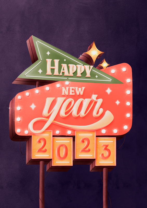 This New Year's postcard is based on retro signs, combining colorful tones and textured elements to give it a vintage feel. The main inspiration for this piece was the classic American diners and motels of the mid-20th century, which used bold lettering and bright colors to attract customers.