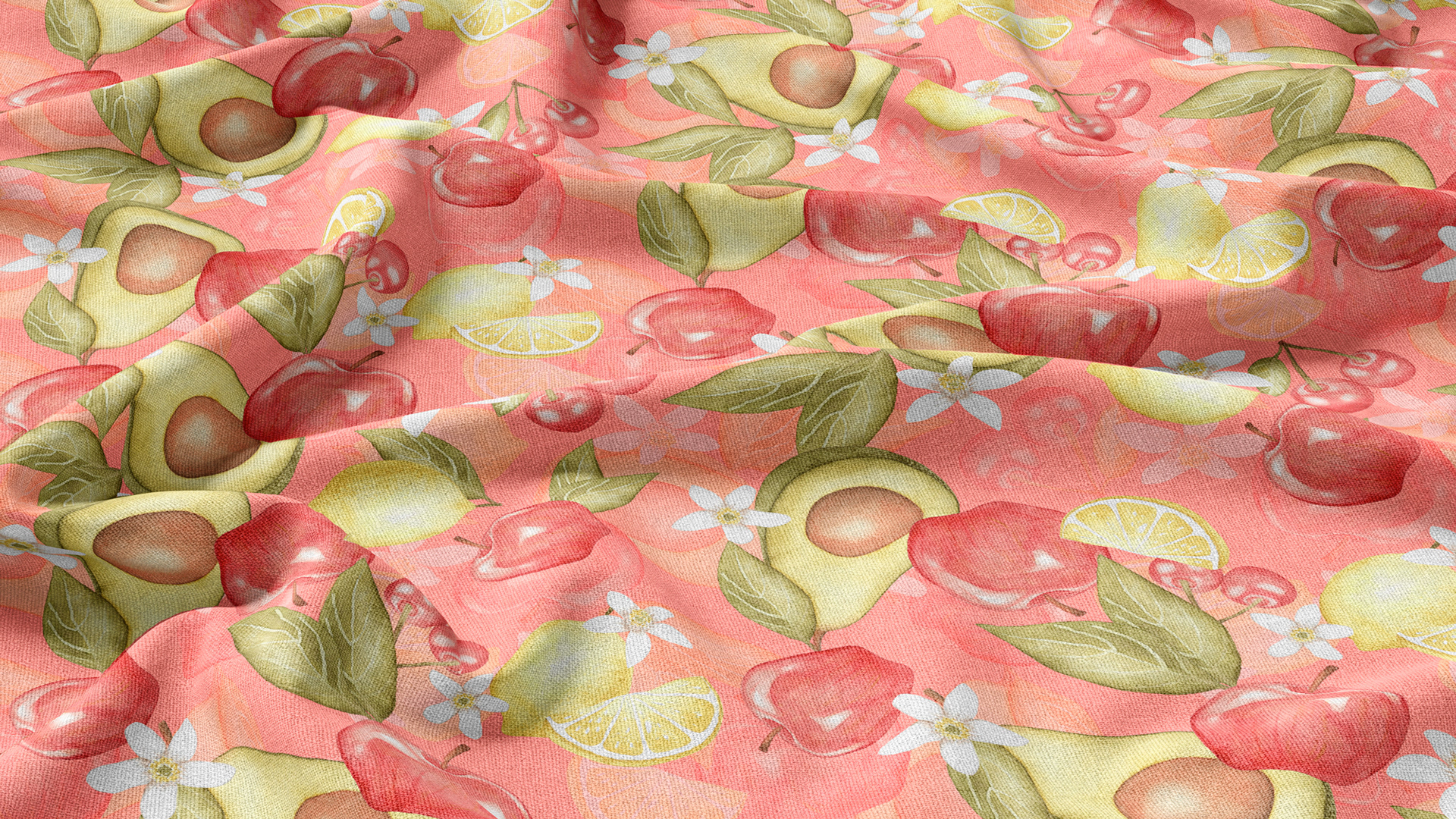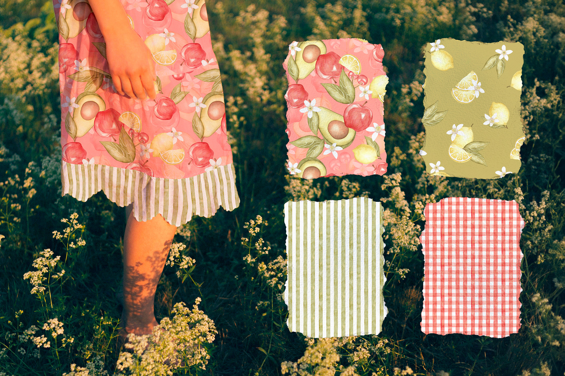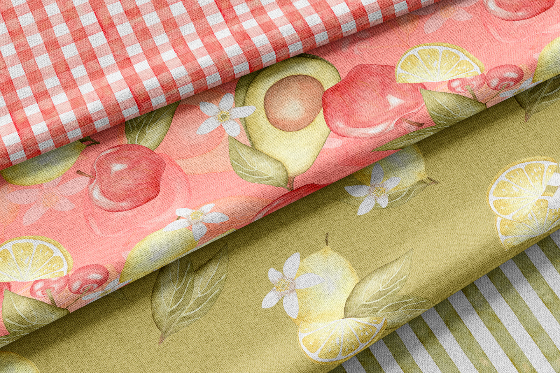 A celebration of seasonal fruits captured in delicately hand-painted watercolor compositions. These patterns have a colorful palette, capturing the essence of summer.